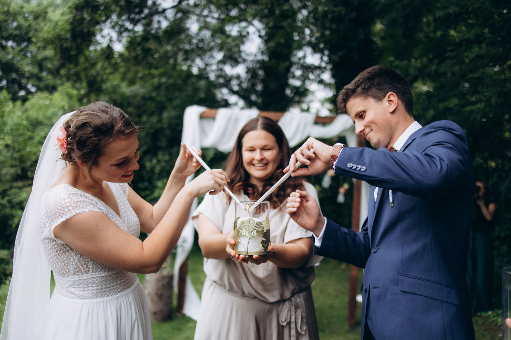 - SVATEBČANÉV den vaší svatby si ještě svolám všechny svatebčany před samotným začátkem rituálu, představím se jim a vše jim vysvětlím a popíšu tak, aby ani pro ně nenastávali nekomfortní situace, kdy nevědí, co dělat nebo co od rituálu očekávat. To vše zajistím sama, abyste se vy mohli plně soustředit na blížící se chvíli.
